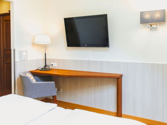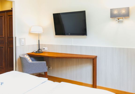 Our smaller rooms (18 - 20m²) bathroom with shower and toilet, hairdryer, cosmetic mirror, luggage compartment, WiFi, wake-up service, telephone and XXL flatscreen TV in HD quality.
