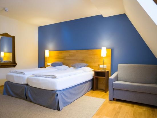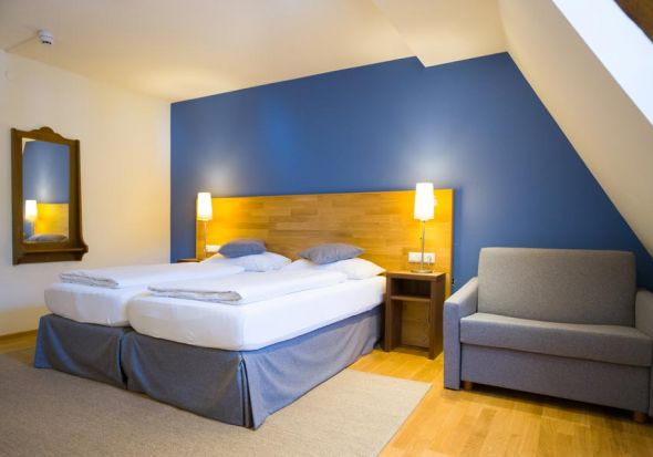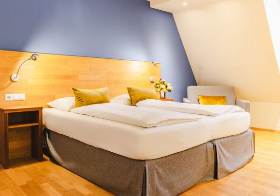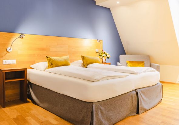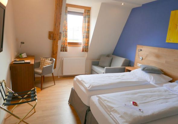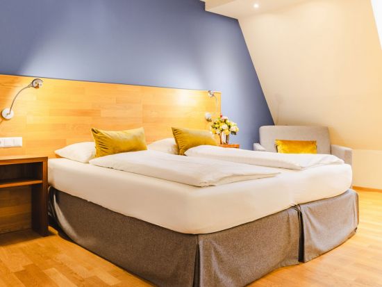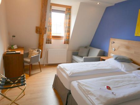 Our spacious (approx. 20 - 25m²) rooms with boxspring beds, oiled natural wood floor, bathroom with shower and toilet, hairdryer, luggage compartment, WiFi incl., wake-up service, telephone and XXL flatscreen TV in HD quality.